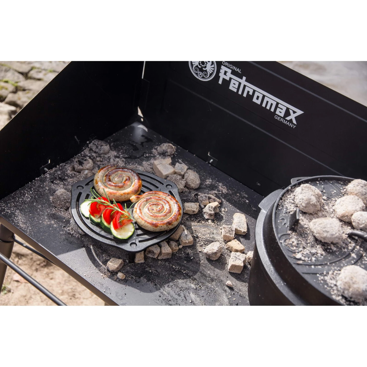 Mit dem Petromax Stapelrost aus massivem Gusseisen gelingen Backen und Garen in den Feuertöpfen (optimale Passform in 4.5, passt aber auch in ft6 und ft9) ohne Anbrennen, denn die Füße schaffen einen großzügigen Abstand. Da der Rost auf der Oberseite kleine Vertiefungen hat, lassen sich mehrere Stapelroste perfekt übereinander stellen: Backen, Dünsten und Dampfgaren wird auf mehreren Ebenen möglich. Dank der drei Füße mit einer Länge von jeweils 4,3 cm steht der Stapelrost auch sicher im Feuer oder auf dem Tisch als Untersetzer. Beim Grillen in der Glut brutzelt er das perfekte Grillmuster ins Fleisch oder dient auch hier als stabile Standfläche für Teekessel oder Perkolator.